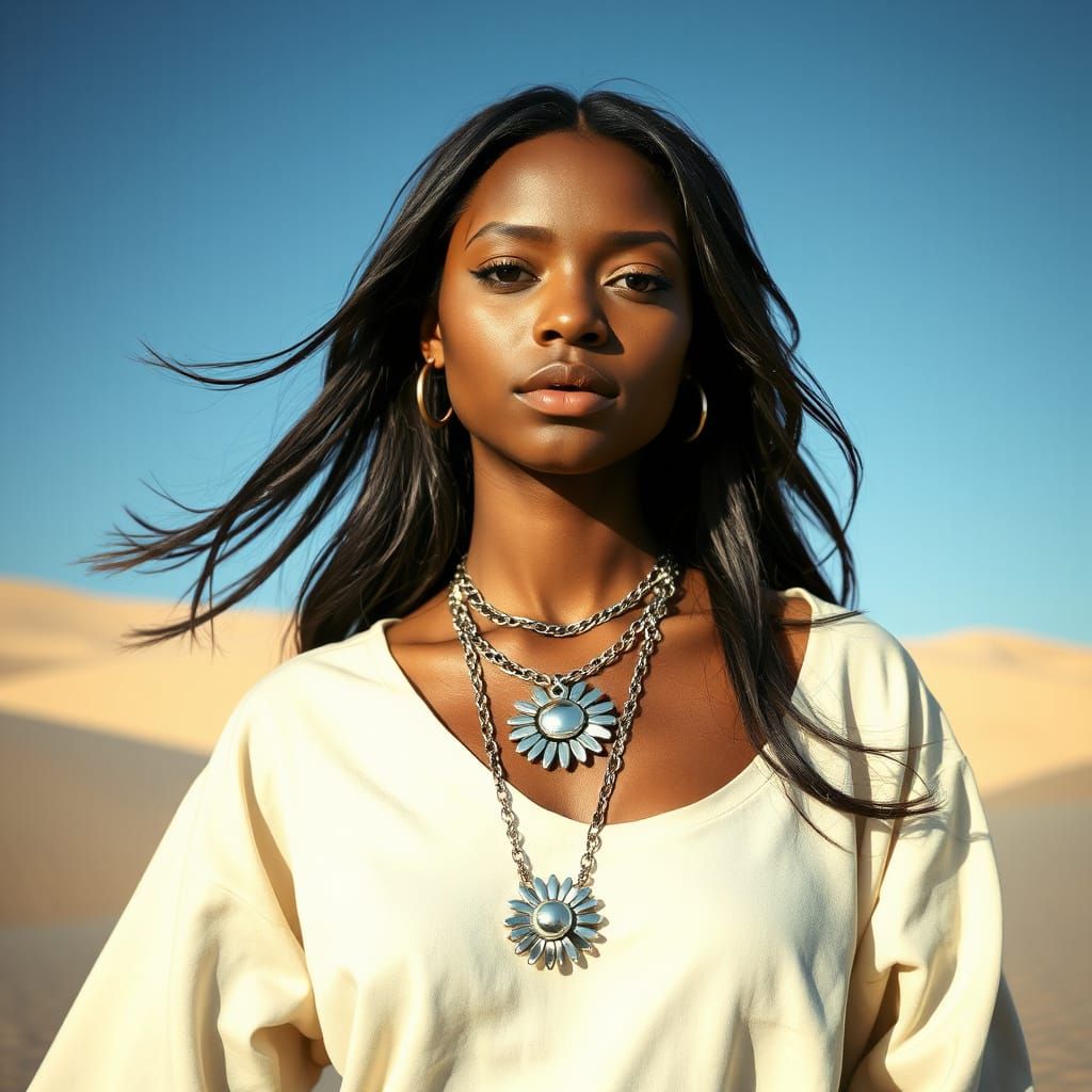 A portrait of a woman with dark skin and long black hair in a desert. She wears layered necklaces and a cream top. The image showcases detailed skin texture under soft lighting.