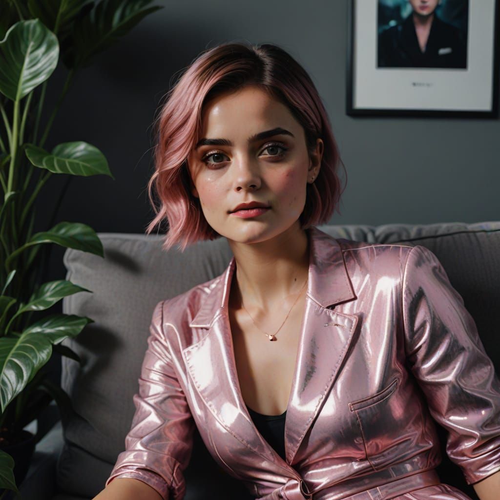 A close-up of a woman relaxing on a sofa at home. She has a pink hairstyle and makeup and is wearing fashionable clothing. The image is reminiscent of Gerhard Richter's style, with moody shadows and bold colors.