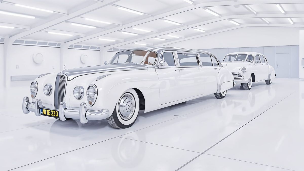 This image shows a super sleek, polished white and chrome 1940s limousine with panoramic windows, detailed features, set in a dark future hangar. Captured with professional photography techniques for sharp focus and bokeh.