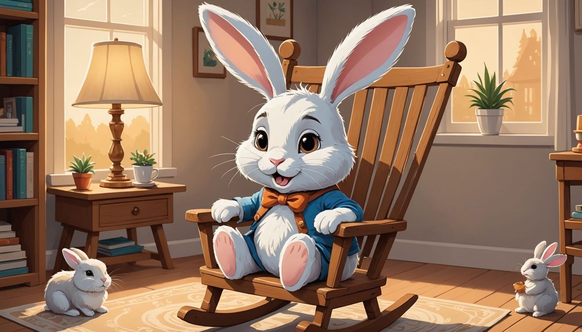 Uma (((obra-prima))) de Angela Fang Zirbes, apresentando um (((adorável coelho em estilo de desenho animado, docemente desenhado em uma cadeira de balanço confortável e solta...