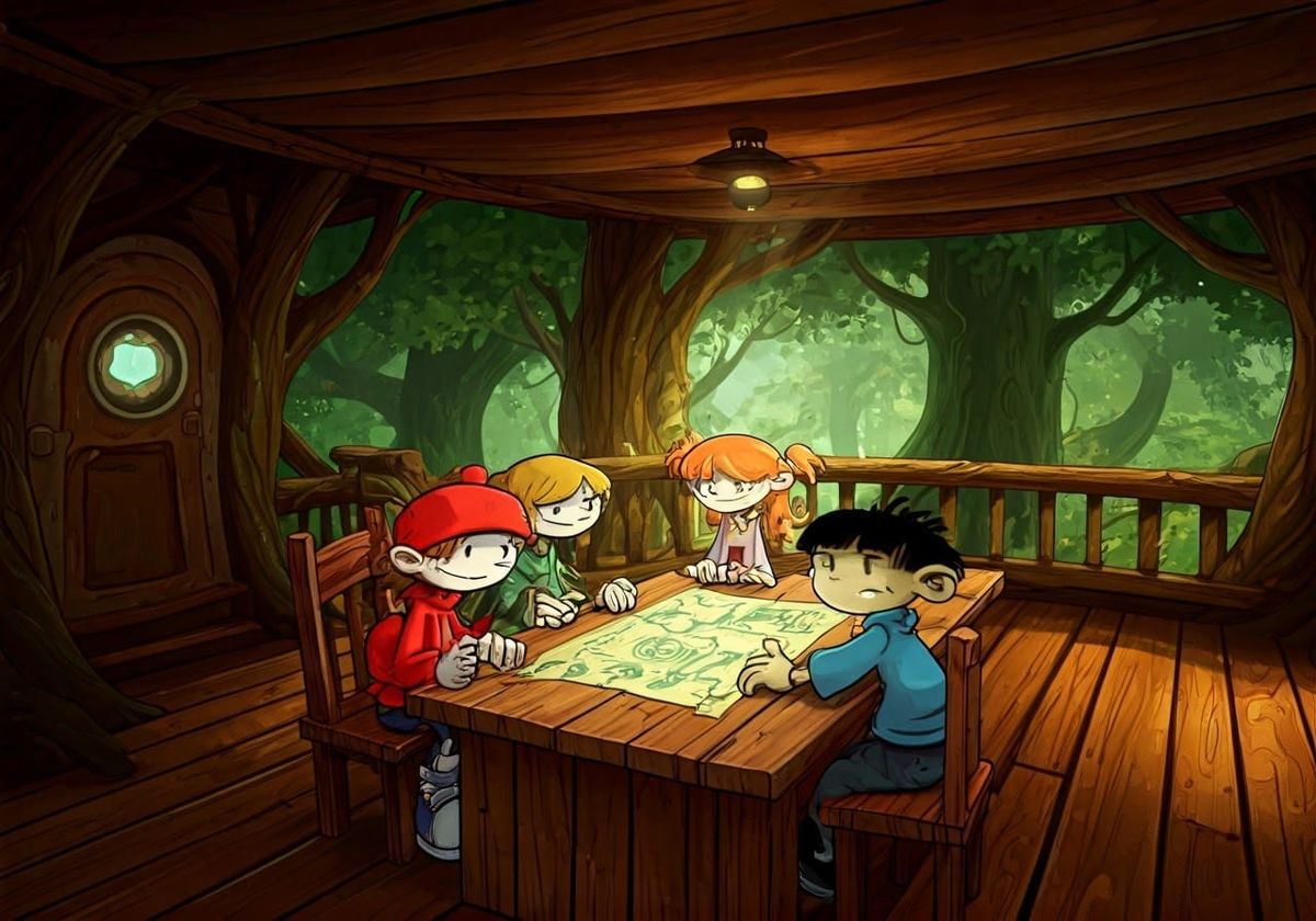 A group of energetic kids from the Kids Next Door cartoon series plan their next top-secret mission in their high-tech treehouse, blending seamlessly into the surrounding forest with intricate wooden architecture and lush green foliage, in a vibrant, stylized anime aesthetic reminiscent of Studio Ghibli ...