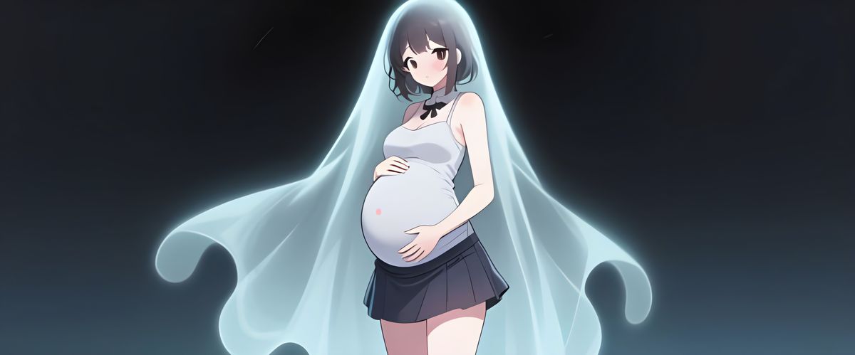 This anime-style image depicts a ghostly pregnant woman, nearly nine months along, wearing a short skirt. The artwork captures a serene yet ethereal mood.