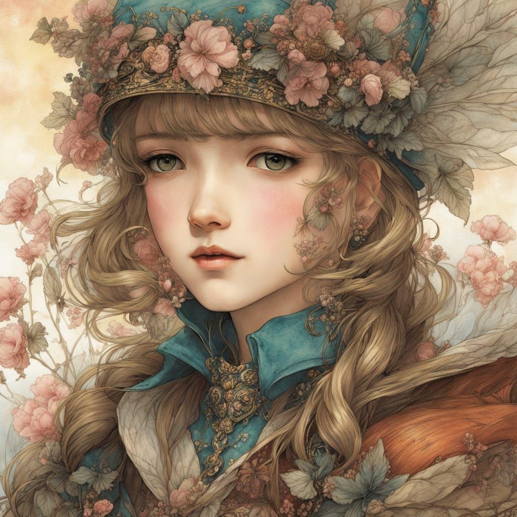 This image shows a tender portrait of a girl with a gentle blush. The artwork evokes the style of Arthur Rackham with anime influences, rendered in a beautiful, colorful, and detailed manner.