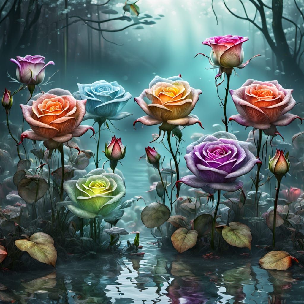 This image showcases multicolored glass roses with translucent petals emerging from bubbling water, accompanied by rising ghosts and misty swamp background. It captures a mystical, highly detailed atmosphere with vivid colors.