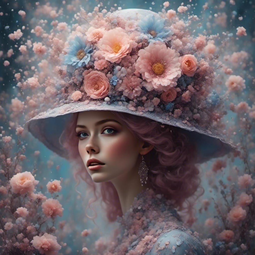This image is a beautifully rendered pastel illustration of a lady in an Easter bonnet, surrounded by intricate details and vibrant colors, creating a hyperrealistic and cinematic scene.