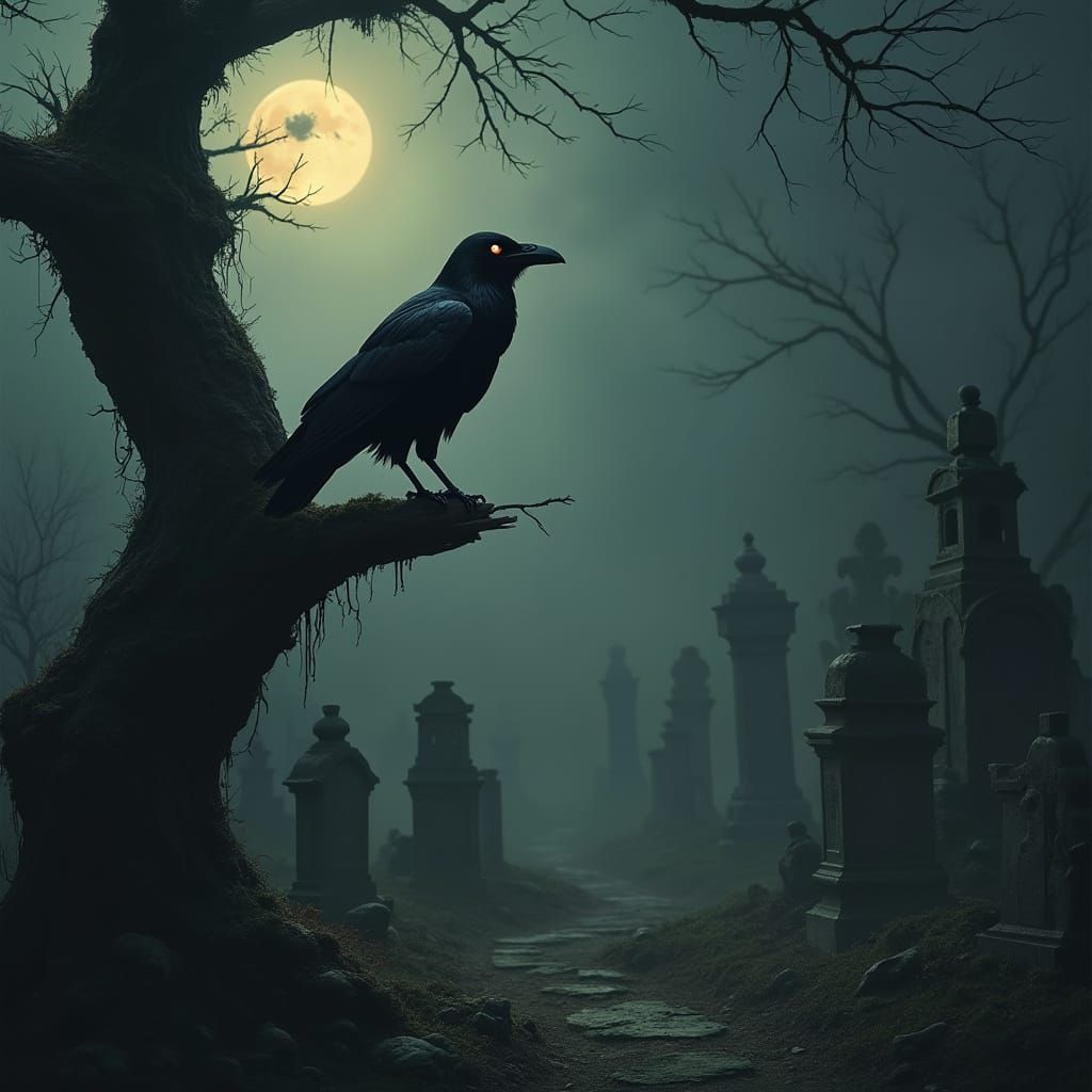 This image shows a raven with tattered black feathers perched on an old tree in a graveyard. Crumbling tombstones, eerie mist and ominous lighting create a gothic atmosphere.