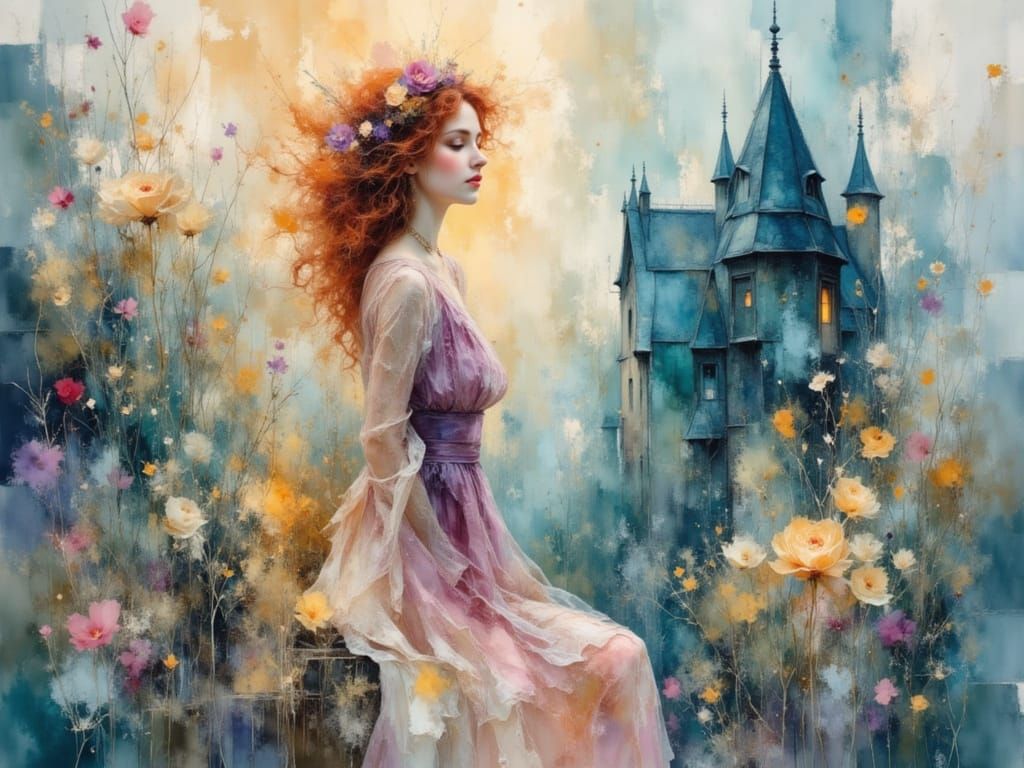 This image shows a dreamlike art nouveau scene with a beautiful girl in a watercolour and ink style. The piece features deep colours, hyperdetailed textures, and an impasto effect reminiscent of oil paintings.