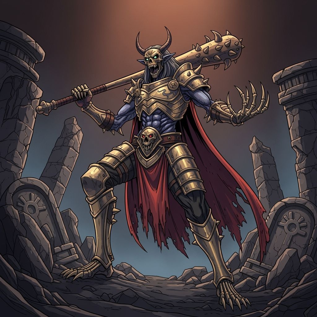 A towering, lean Warwraith in tattered ancient armor wields a colossal club amidst tomb ruins. This image features vibrant cel-shading and bold lines, evoking manga-inspired visuals with dramatic lighting.