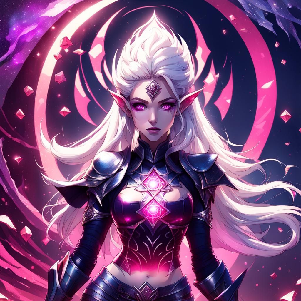 This image shows a curvy astral elf woman with platinum hair and rubellite eyes. She is wearing a skimpy outfit, suggestive of fantasy armor.
