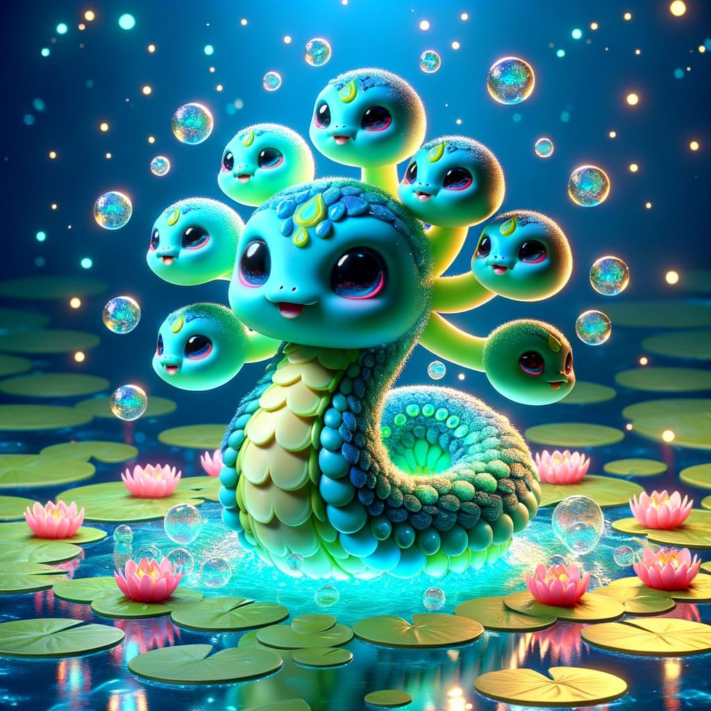 This 3D cartoon image features an enchanting turquoise baby creature with seven unique heads, inspired by the Hydra myth. It sits in a lily pad pond, surrounded by colorful bubbles, in a whimsical, magical setting.