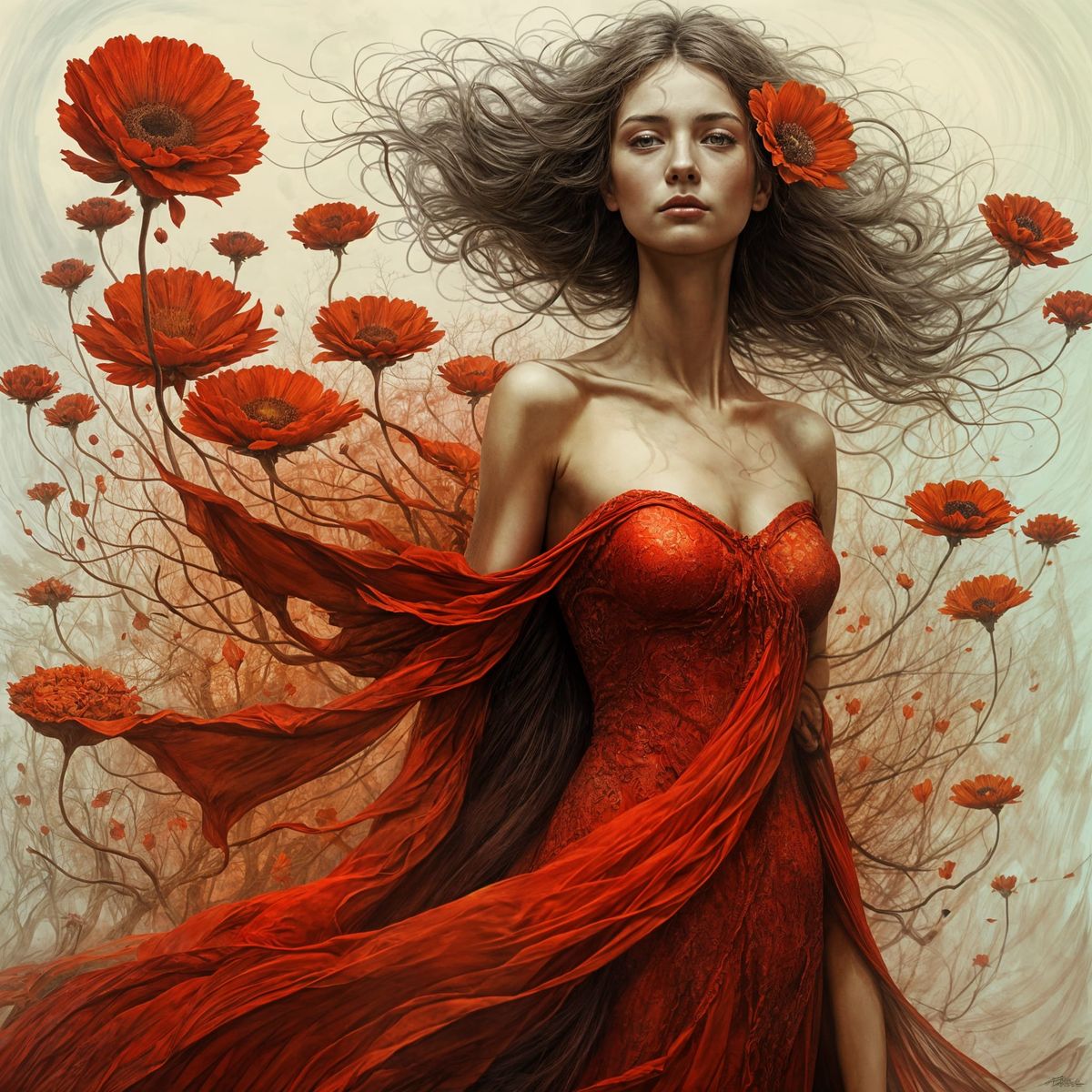 This image shows a beautiful woman in a red dress striking a dynamic pose. The background features detailed floral patterns in a hyperrealistic digital art style with acrylic painting effects.