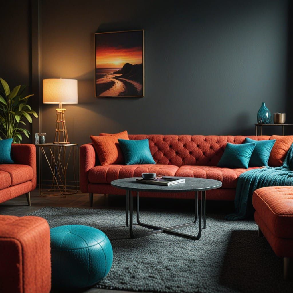 This image showcases hyper-realistic felted living room furniture in bright, bold colors. The photograph captures soft textures and rich, intricate details with dramatic cinematic lighting, high contrast, and an atmospheric color scheme.