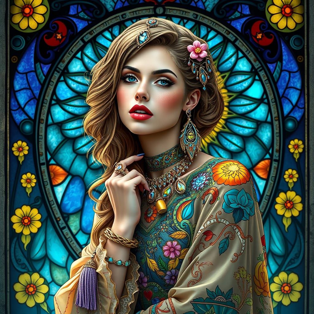 This image shows a woman in detailed, colorful clothing and jewelry, posed within a stained glass tarot card design. The artwork features hyperrealistic textures and vivid colors, reminiscent of digital concept art.