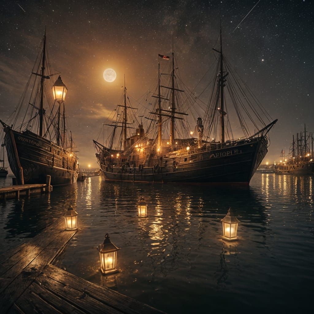 This image shows old wooden ships gently rocking on dark water in a hyper-realistic style. Warm golden light from lanterns on the pier reflects on the rippling sea under a starry night sky.