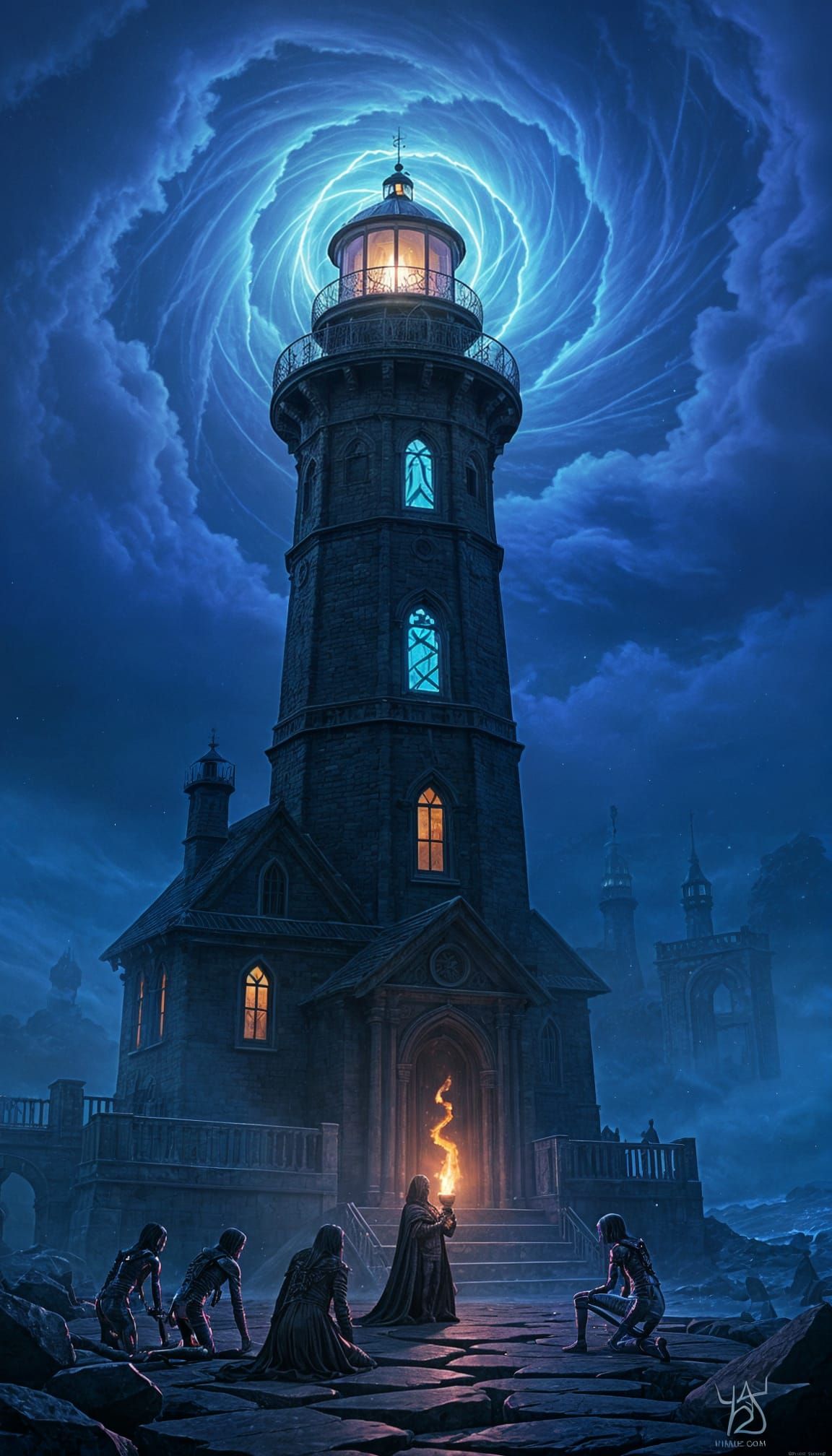 A dramatic image of a gothic lighthouse beset by a violet storm. Ghost ships are drawn to its swirling beam as skeletal figures worship at its base, all rendered with cosmic horror elements.