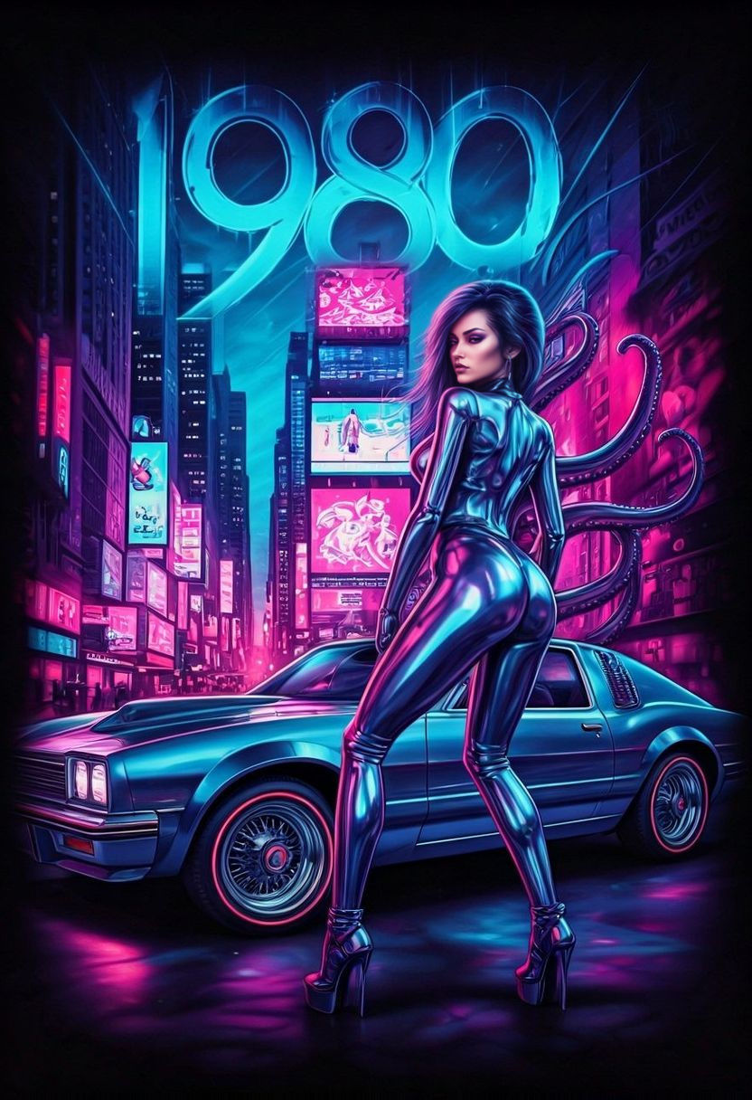 This photorealistic airbrush art shows a cyberpunk woman posing with tentacles against a lowrider in a vibrant, chaotic NYC night. Features dramatic lighting and metallic textures.