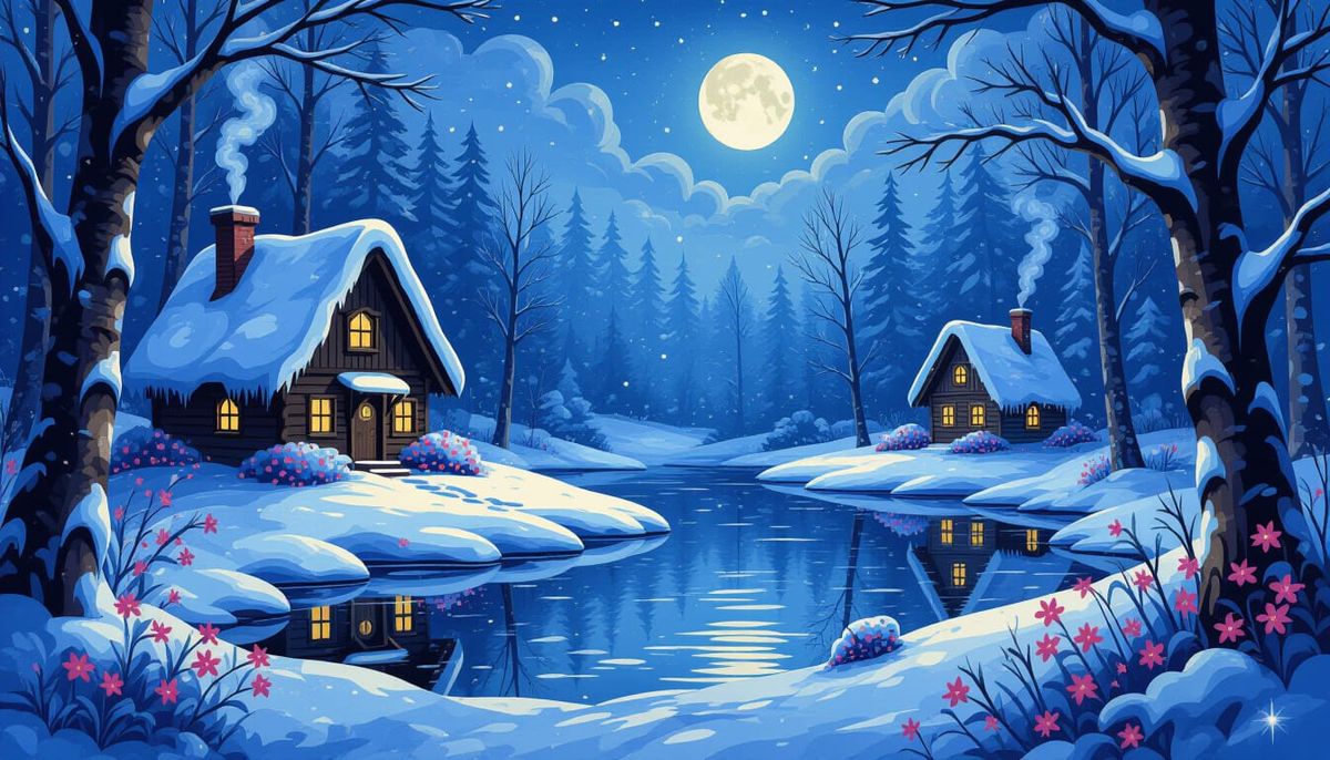 A detailed and elegant picture of fairy houses nestled in a snowy forest by a lake. Moonlight and stars illuminate the scene with flowers, vines, and mist, in a colourful graffiti art style.
