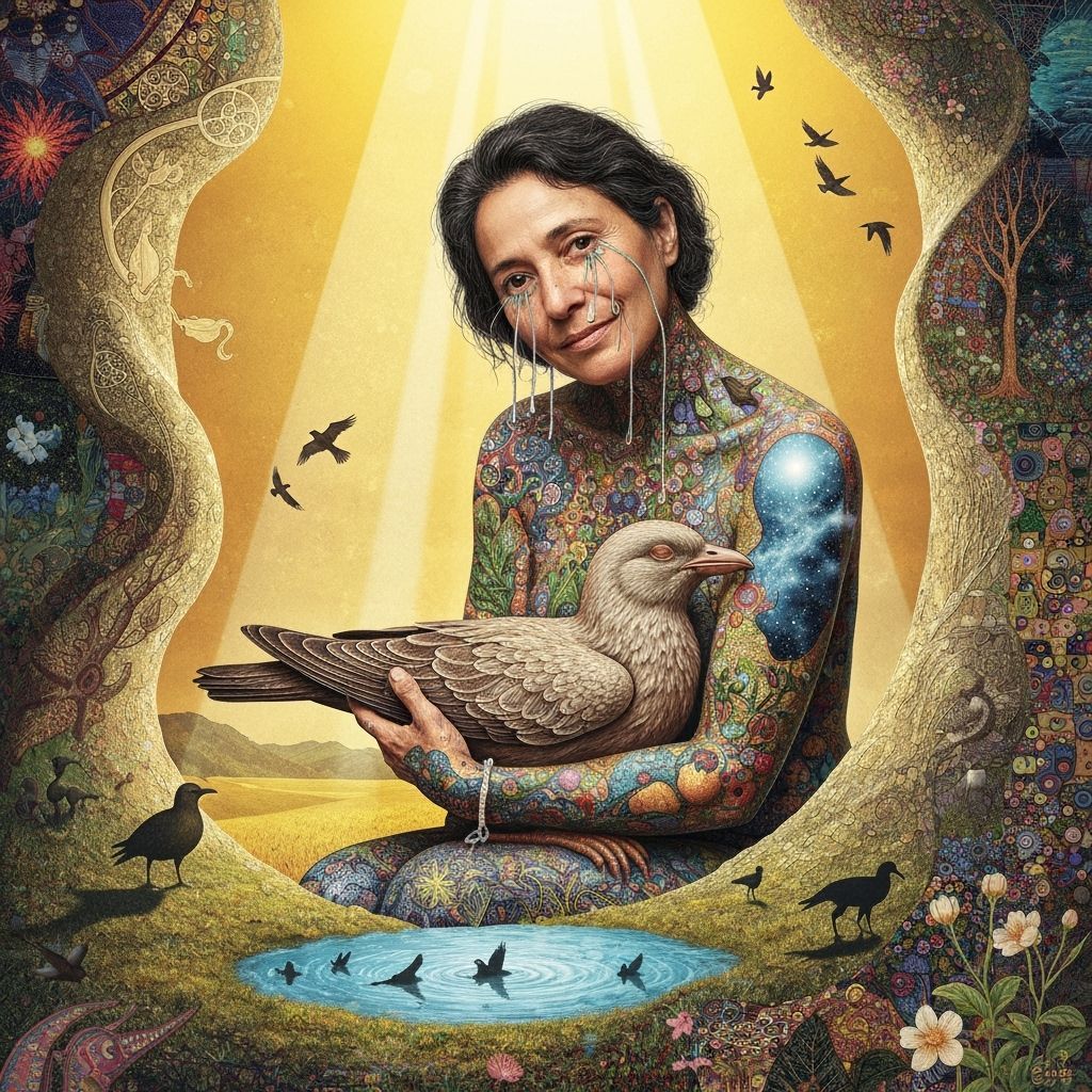 This image shows a satisfied female sculptor inside a massive, abstract sculpture she created. The artwork merges bio art, intricate botanicals, and cosmic energy.