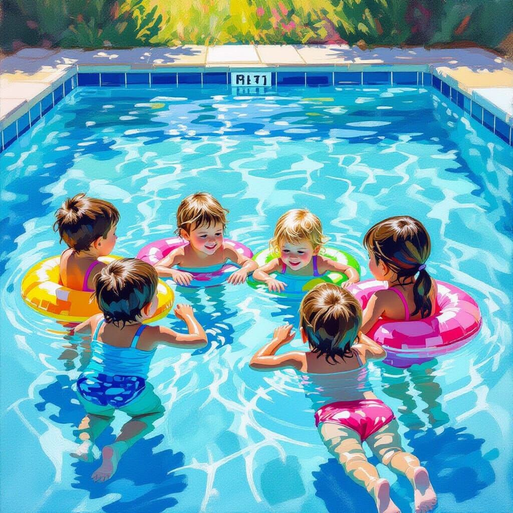 This image shows children learning to swim in a bright turquoise pool. The artwork features delicate brushstrokes and vivid colors, evoking a realistic watercolor aesthetic.