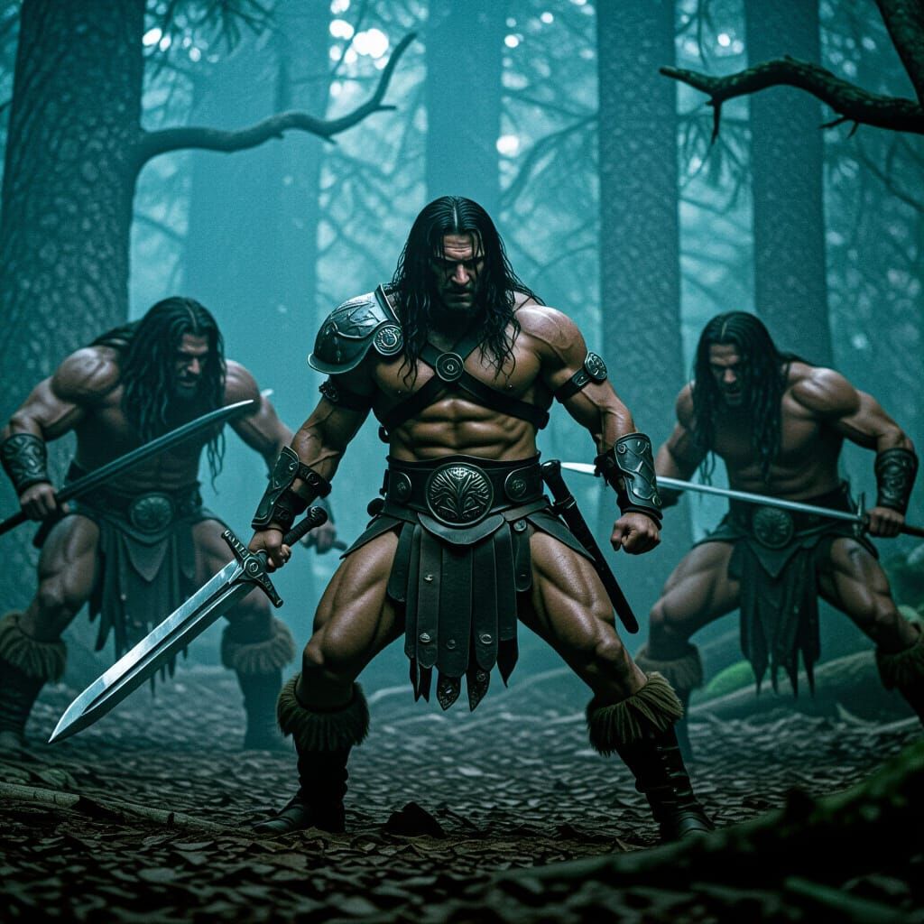 A cinematic image shows Conan the Barbarian in leather armor battling mythical creatures within a dark forest setting. The image evokes a dramatic, epic atmosphere, reminiscent of classic fantasy art.