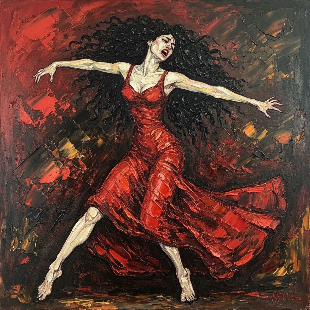 This image shows a woman in a red dress dancing with raw emotion, depicted in thick, dynamic brushstrokes. The art style features vibrant colors and dramatic lighting, reminiscent of expressionist masters.
