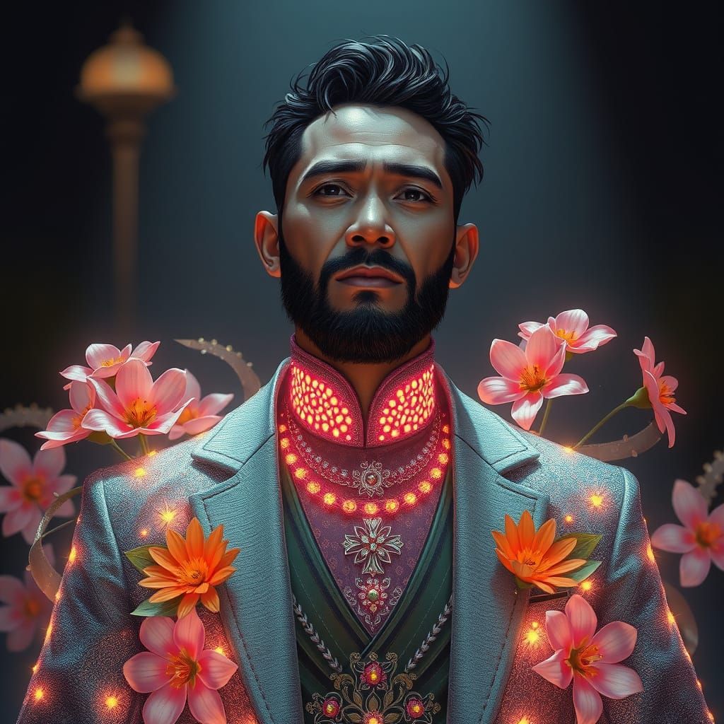 A portrait of a smiling man in a bright suit, surrounded by flowers and warm lights. The image is rendered with thick textures and deep shadows in a YuYoI-inspired style.