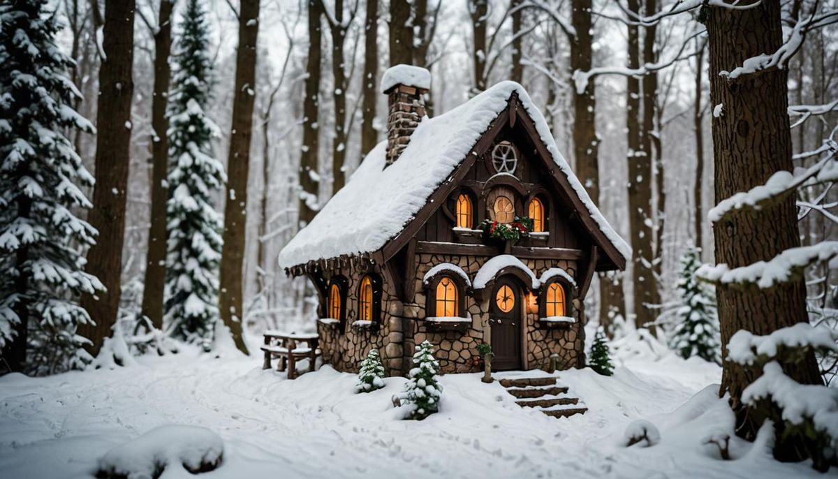 This image shows a magical fairy house nestled in a snowy forest. Captured with professional photography techniques, the scene features soft bokeh and natural lighting.