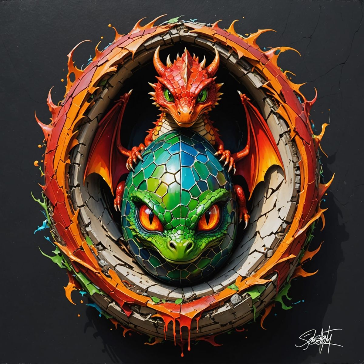 A stunning, ultra-detailed image of a baby dragon bursting forth from its nest, set against a warm evening backdrop with green eyes shining bright, created in a vibrant, high-contrast graffiti art style.