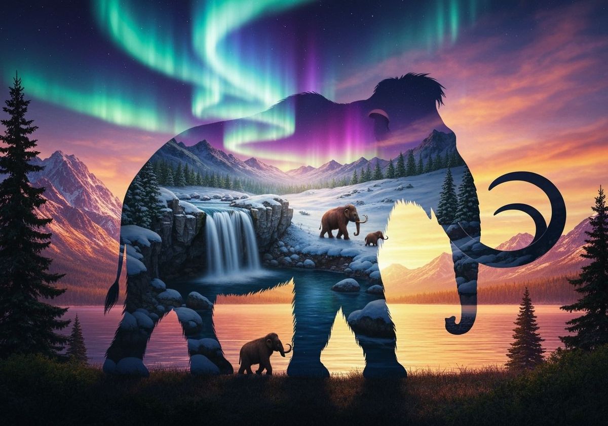 This image shows a double exposure featuring a mammoth silhouette against a sunset. Inside the mammoth, a winter scene unfolds with mammoths, a waterfall, and the aurora borealis. The image conveys wonder and tranquility.
