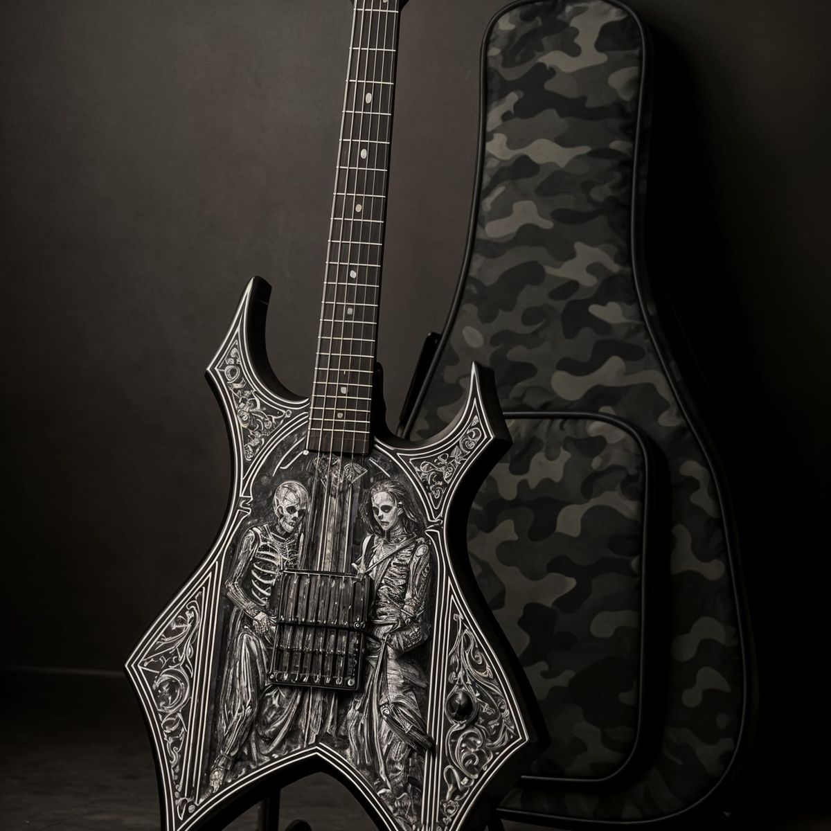 This image showcases a B.C. Rich Warlock guitar with a medieval skeleton diptych finish, standing on a guitar stand next to a camouflage carrying case. The guitar features intricate detailing in black and white.