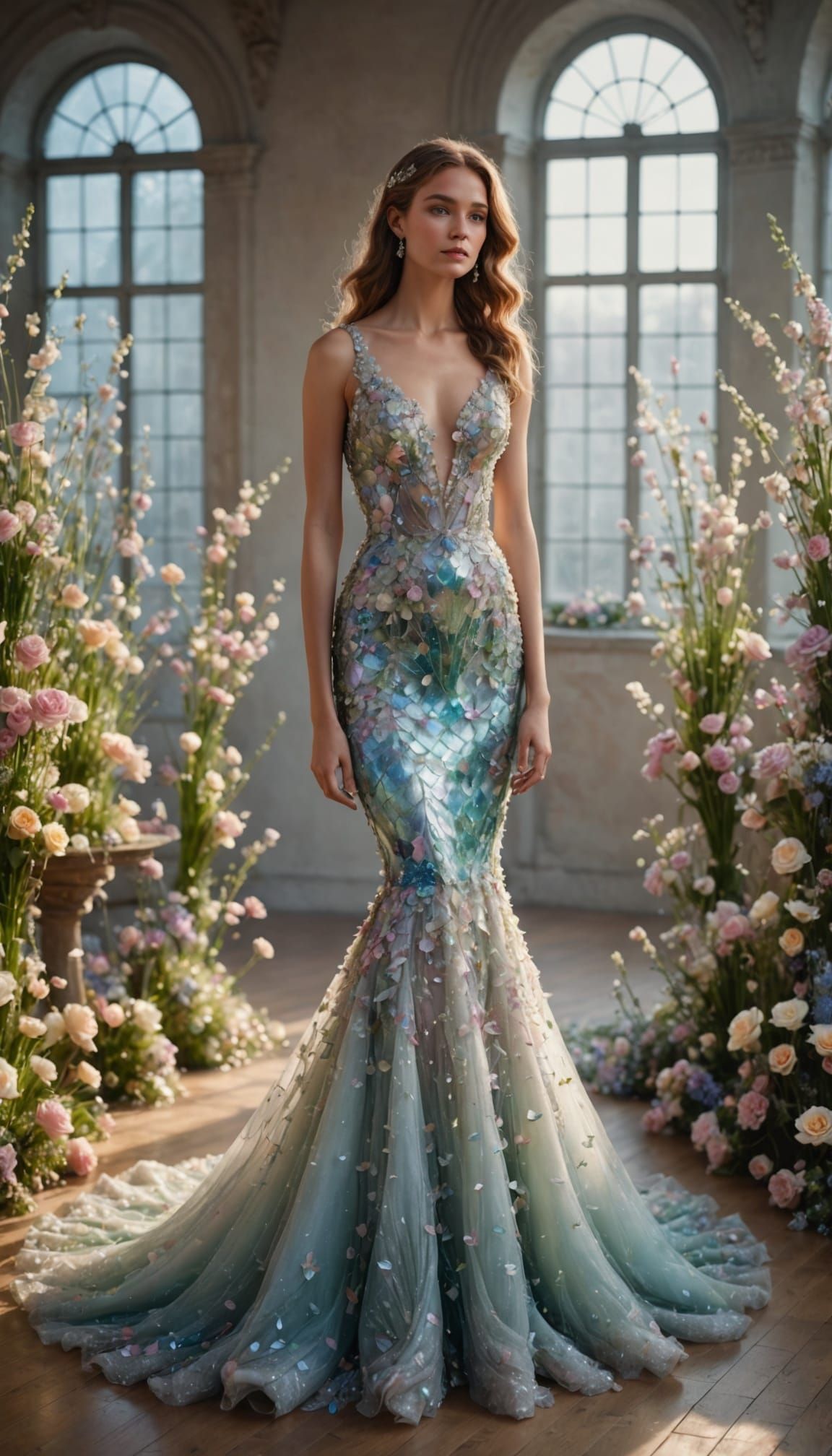 This image shows a serene woman in a luminous studio, wearing an exquisite gown of glass flowers dissolving into light. The scene blends fashion and fantasy with cinematic lighting and hyperrealistic detail.