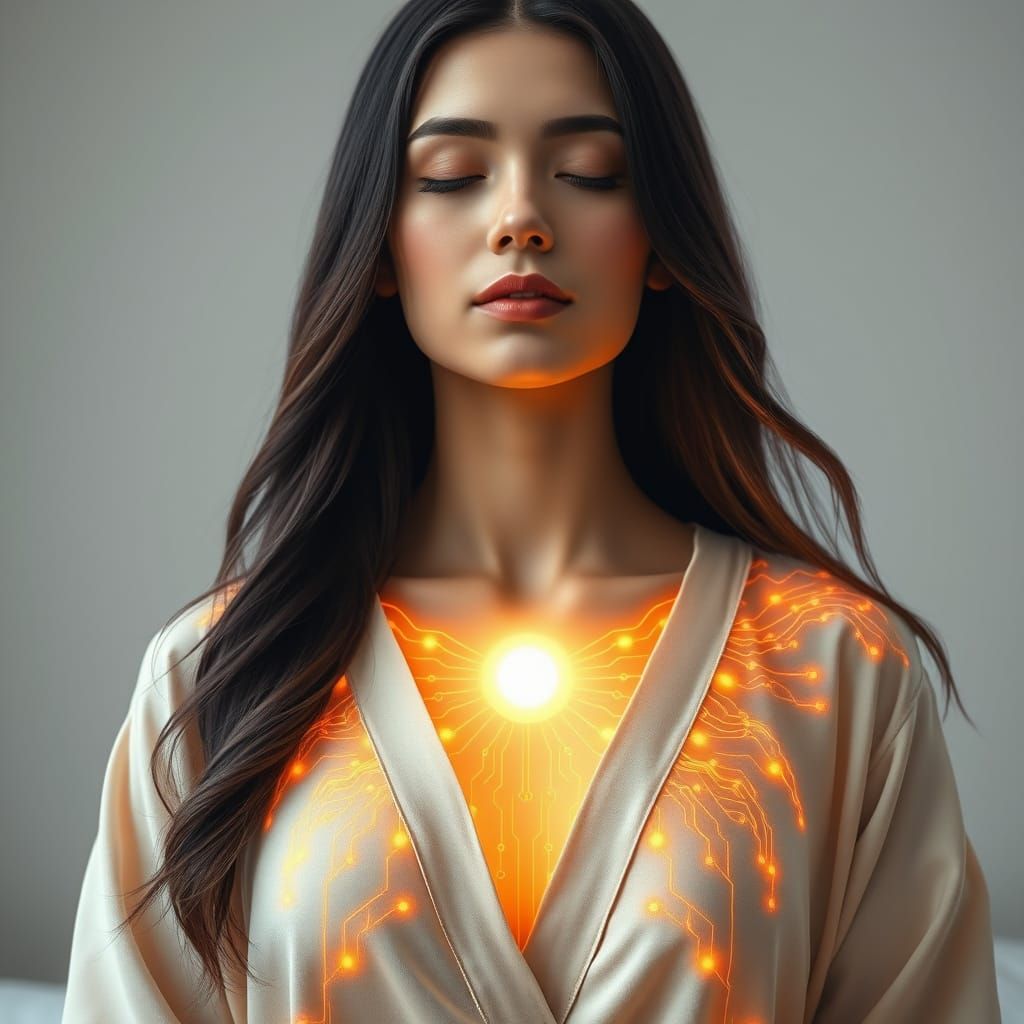 A photorealistic image of a woman in a peaceful trance, with intricate orange and yellow circuitry patterns glowing from her chest and neck. She has long dark hair and a serene expression.