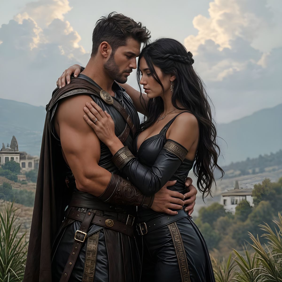 This image depicts a Grecian mercenary holding a beautiful woman in his arms. She is wearing leather pants and a long coat. The background shows lowlands in Ancient Greece. The image is a digital matte painting.