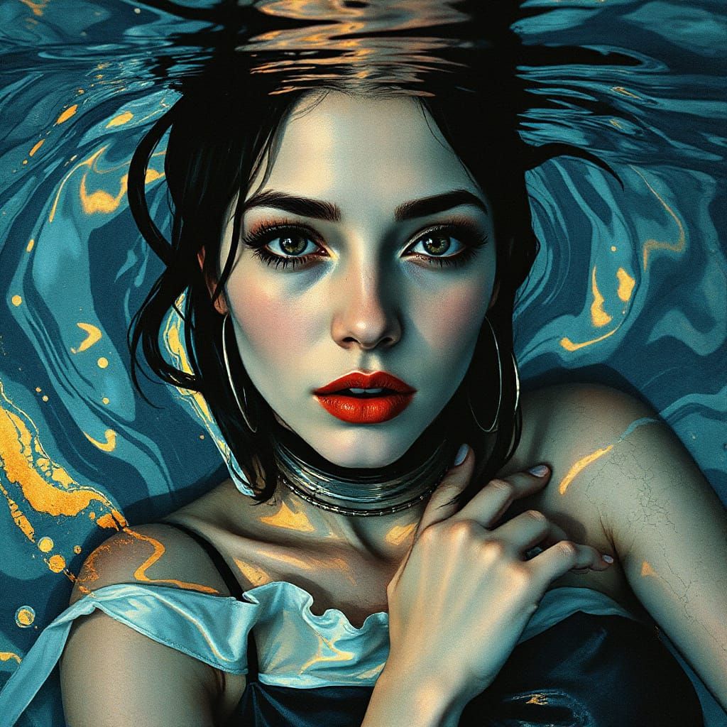 A captivating portrait of a woman submerged in rippling water, with shimmering skin, swirling colors, and distorted reflections, evoking a sense of mystery and unease, in a style reminiscent of glitch art and vorticism.