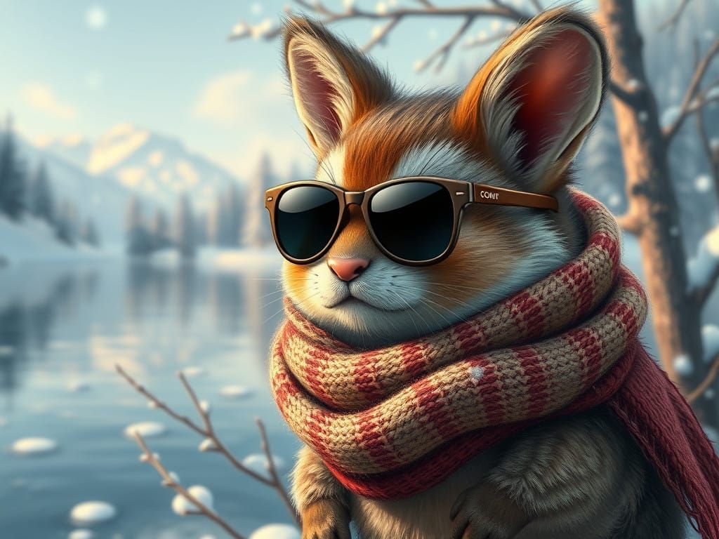 A charming fox in a scarf and sunglasses by a frozen lake, rendered as a detailed, textured oil painting with deep, complementary colors in a fantasy concept art style.