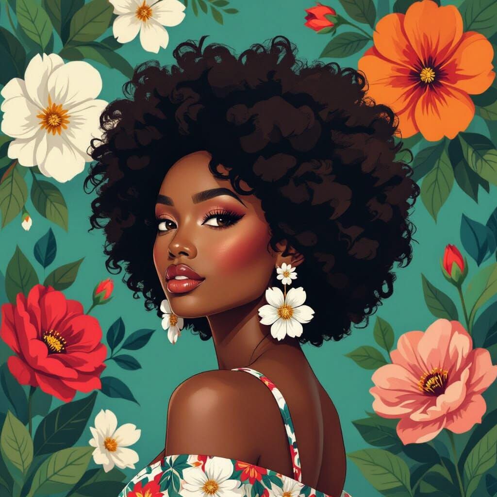 A digital illustration of a Black woman with an afro, glancing over her shoulder confidently. She wears floral earrings and is set against a backdrop of large, vibrant flowers in a bold aesthetic.