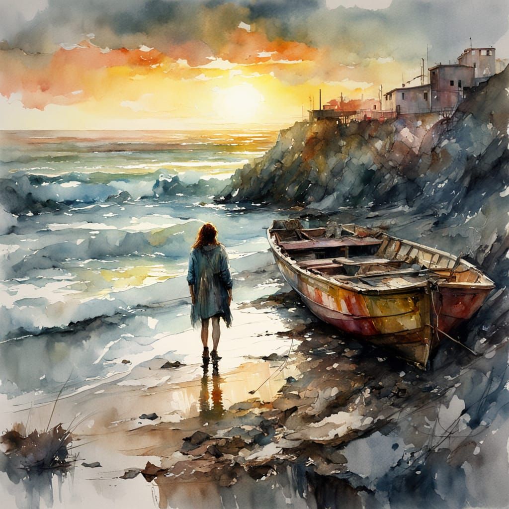 A striking picture of a woman near an old boat on a rocky shore during a sunset. The watercolor painting uses dramatic lighting and deep colors in a fairytale style.