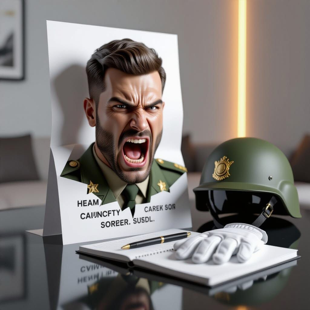 Na staklenom modernom stolu stoji uspravljeni papir i na njemu je nactrano hiper realisično 3d lice vojnika i psuje dok gleda u kameru a i dalje je povezano sa papirom ali nepovezane reči psovke i ljuto lice viču glasno u pravcu kamere. Pored papira na stolu je sveska a na njoj vojnički šlem savremene ...