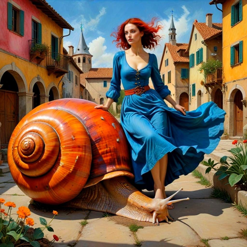 highly expressive photorealistic full-height image of charming mature medieval lady in active movement in complex strange fantastic surrealistic scene, fantasy, surrealism, photorealism, hyperrealism, minimalism, crisp image, precise, detailed, textured, vivid vibrant colors, intense contrasting colors, ...