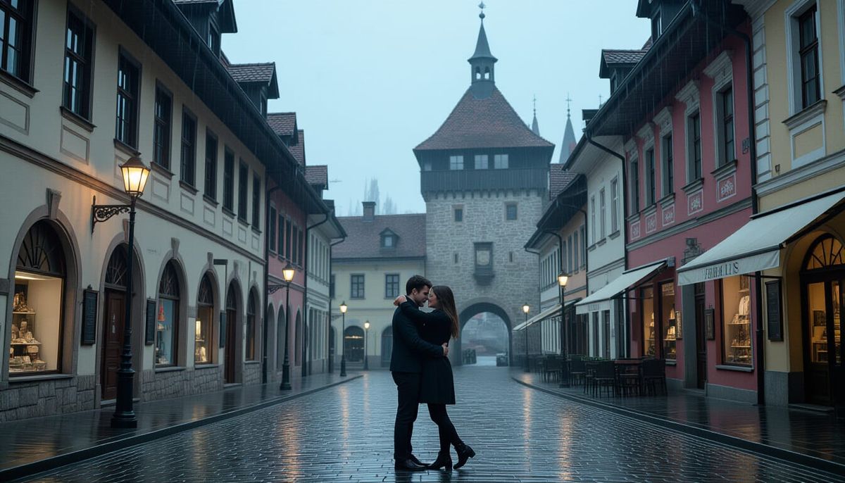 A cinematic image of a couple embracing in Brasov's Weavers' Bastion, set against a backdrop of rainy streets and dramatic shadows. The image evokes a stylized aesthetic with dramatic lighting.
