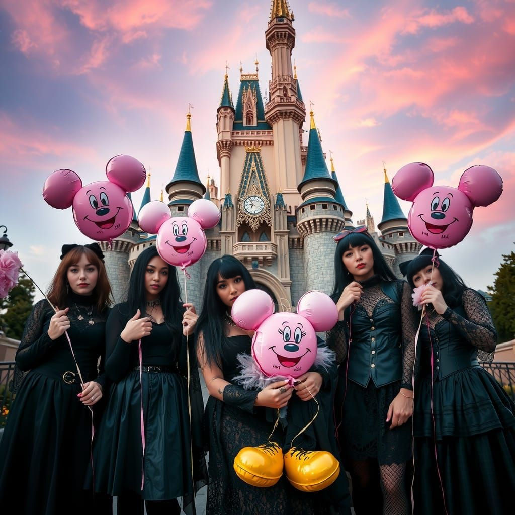 This photorealistic image captures a group of goths in front of a fairytale castle, contrasted with bright cartoon surroundings. They hold Mickey Mouse balloons and eat cotton candy while looking unenthusiastic.