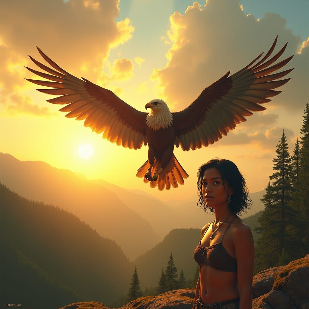 A striking picture of a griffin soaring through a sunlit sky alongside an Indian woman. The scene features rolling hills and ancient forests under a golden glow in a cinematic style.