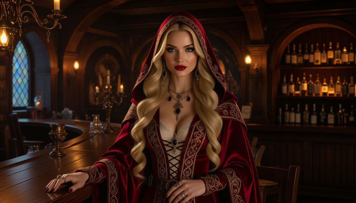 This photorealistic image depicts a female sorceress with styled blonde hair and opal accents standing at a bar in a fantasy tavern. Dramatic lighting and cinematic detail enhance the scene.