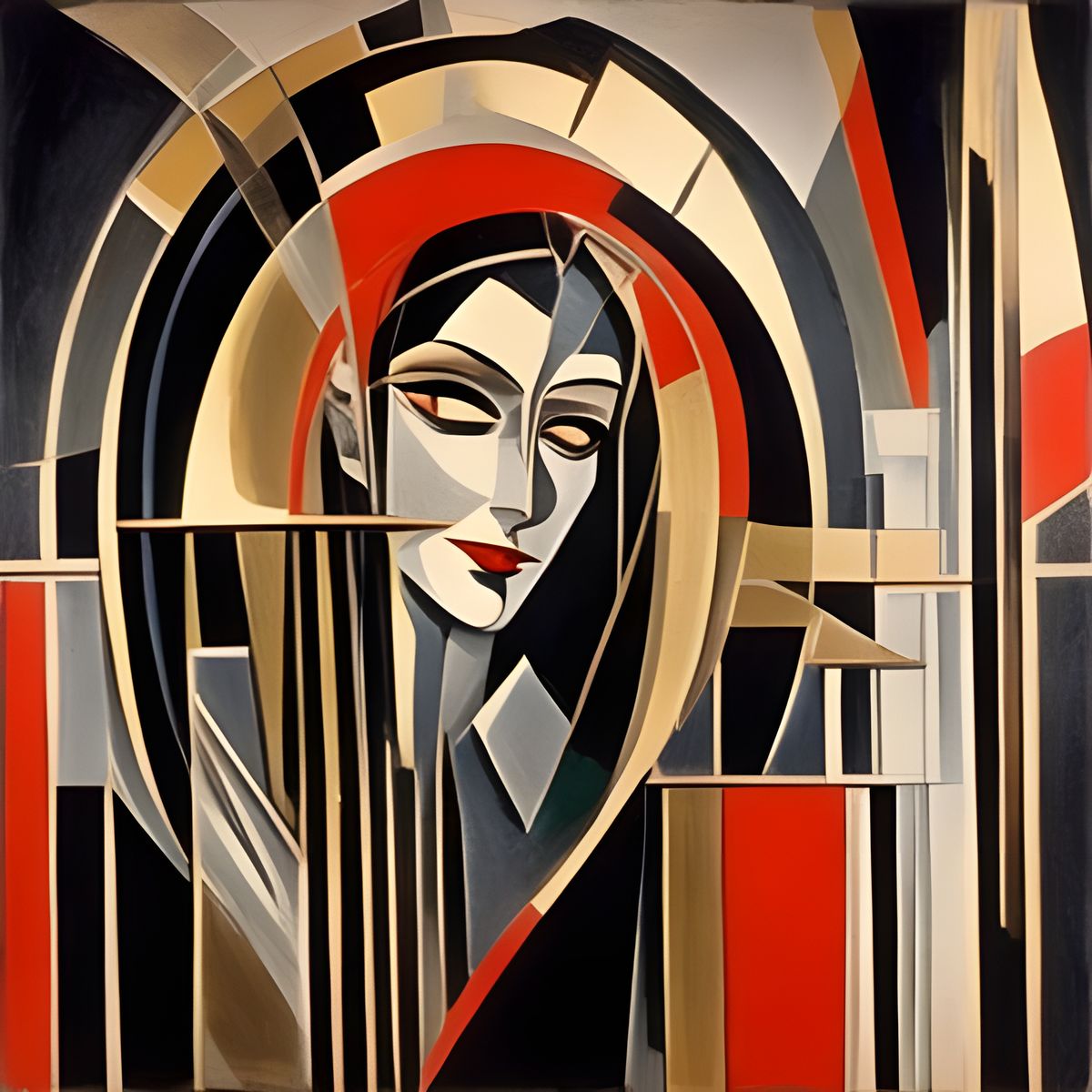 This image shows a stoic, confident Art Deco style 'Queen of Industry' portrait. The symmetrical image features decorative gold and black elements reminiscent of 1930s New York.