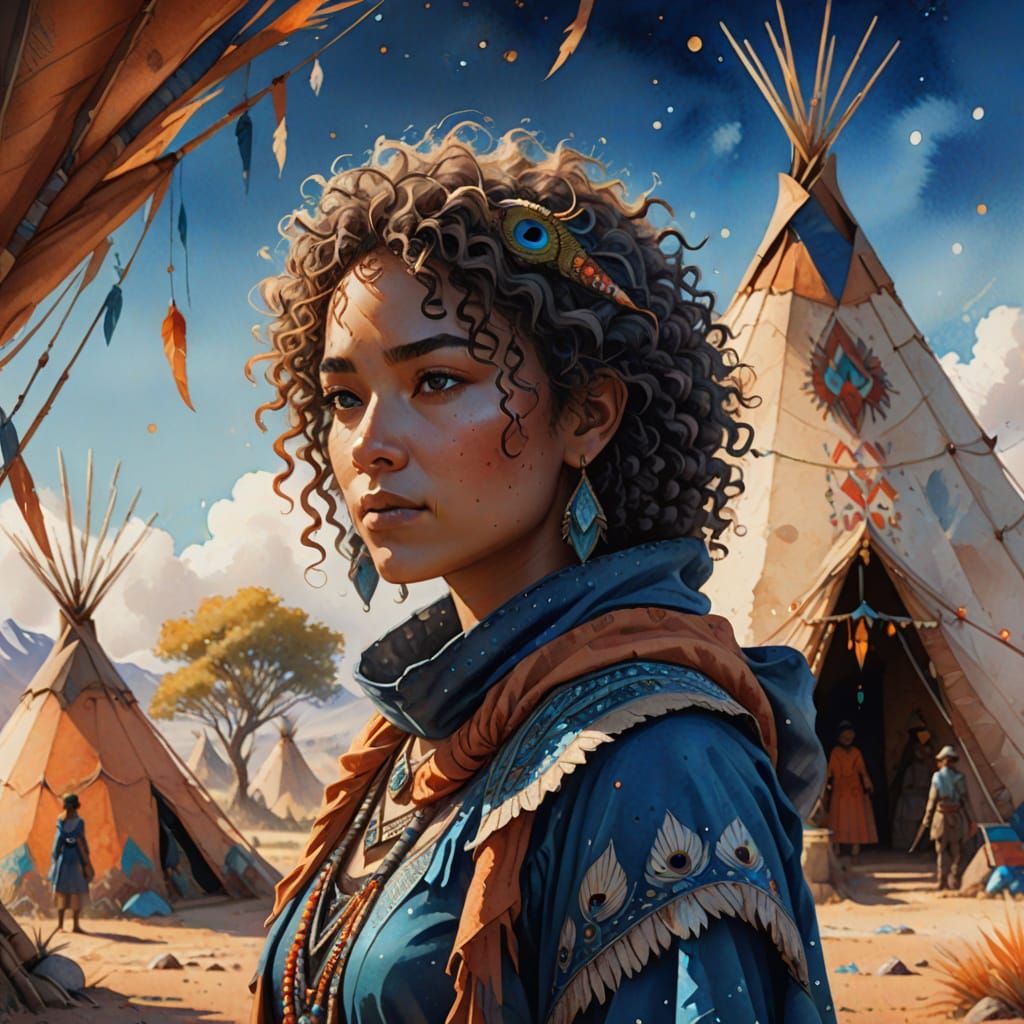 A watercolor image shows a woman with curly hair standing near a tipi. Sparkling crystals, peacock feathers, and sunshine fill the scene with deep blues and oranges in a fantastical style.