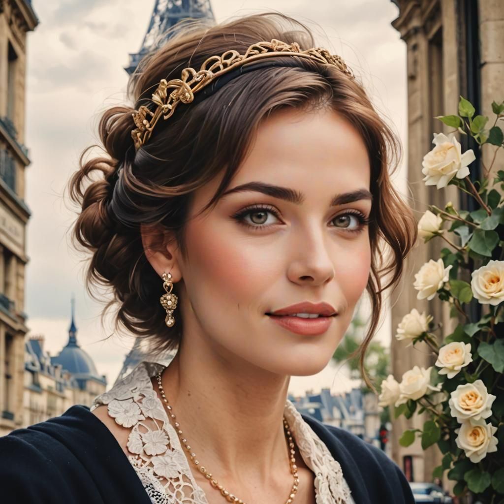This image shows a beautiful woman in a classic Parisian setting. The photo captures the essence of romance and timeless beauty within the iconic city.