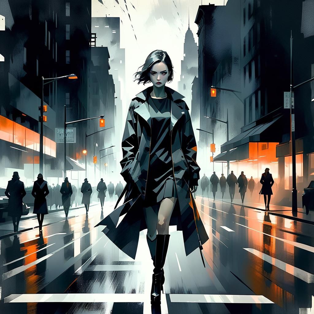 This image shows a determined woman walking along a dark city street in a double exposure effect. The scene is ominious, with directional lighting and dark colors, in a rough watercolor style.