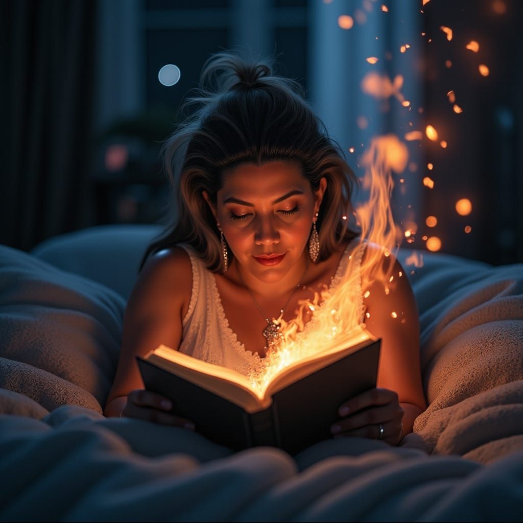 A mother safeguards her children from flaming rainbow arrows as they read their Bible in bed, with a massive shield of heaven protecting them from harm