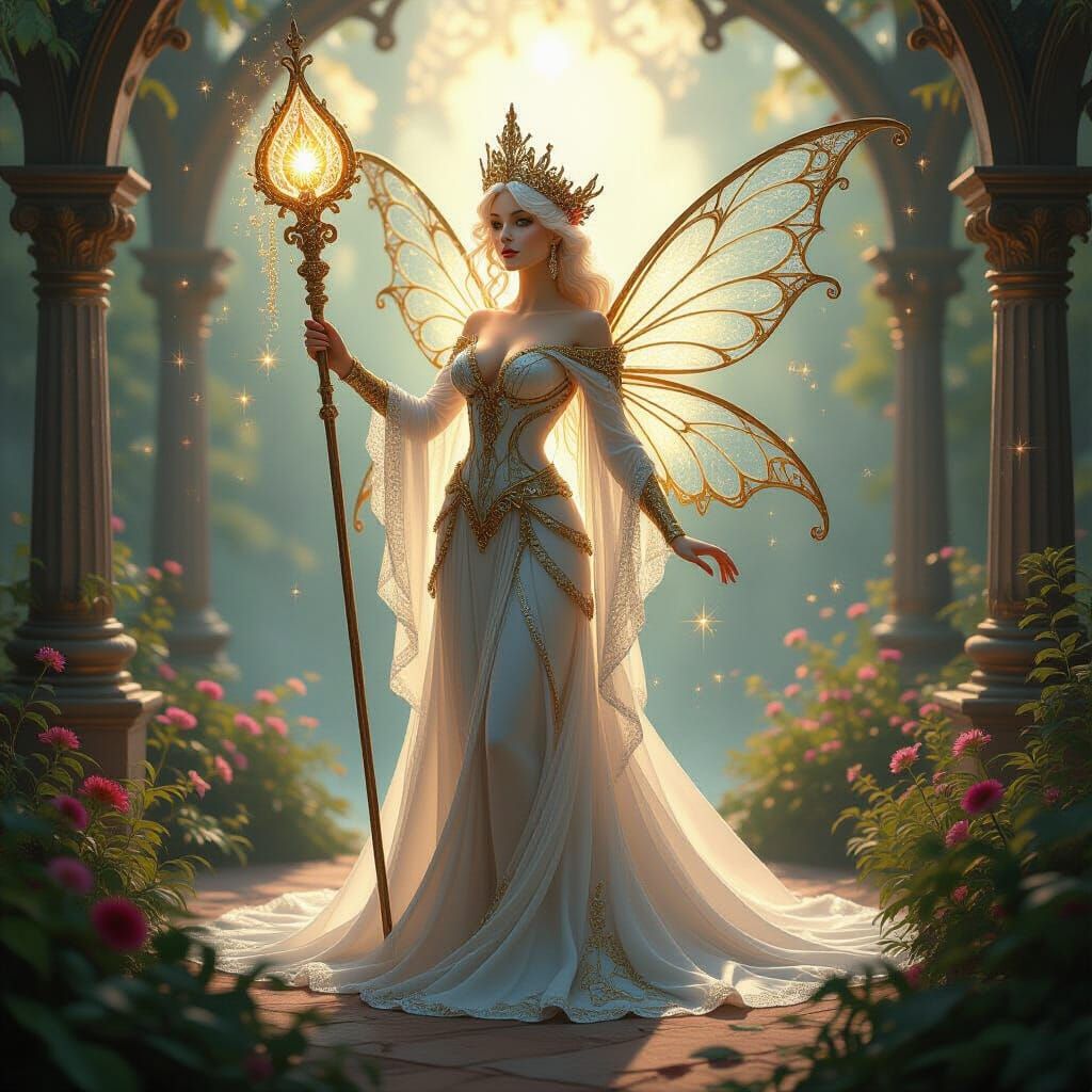 This image shows a beautiful fractal glass fairy queen holding a golden staff, surrounded by sparkling dust. Rendered as an impasto oil painting with ethereal backlighting, it captures mystical grandeur.