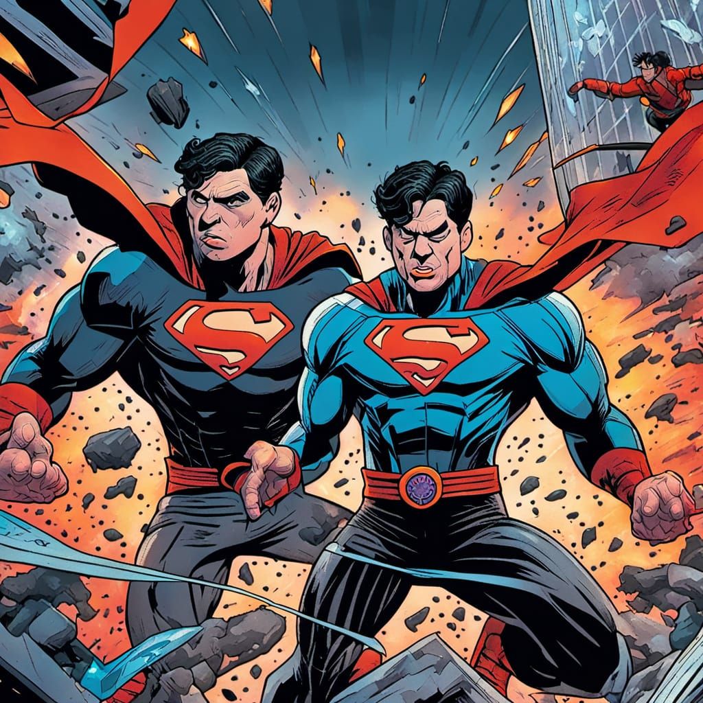 This image shows a dynamic comic book art scene of Bizarro SuperBoy battling multiple opponents in a vibrant, action-packed depiction of Washington DC, reminiscent of DC comics style with bold lines and detailed textures.